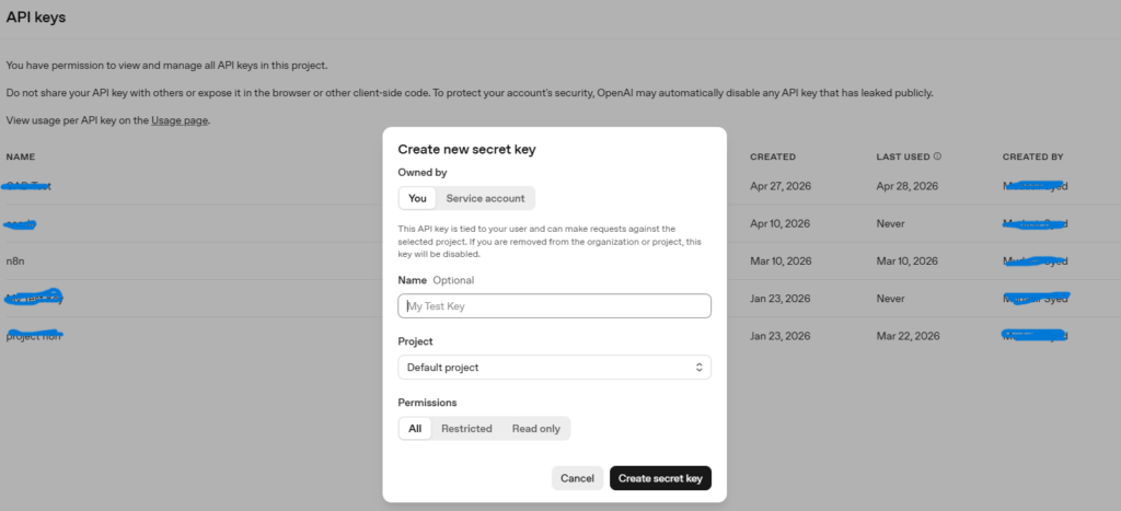 - Give the key a descriptive name — use something like “n8n-prod”, “cursor-dev”, or “project-name-env” so you can identify it later